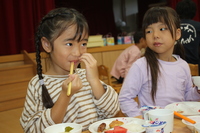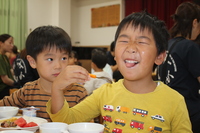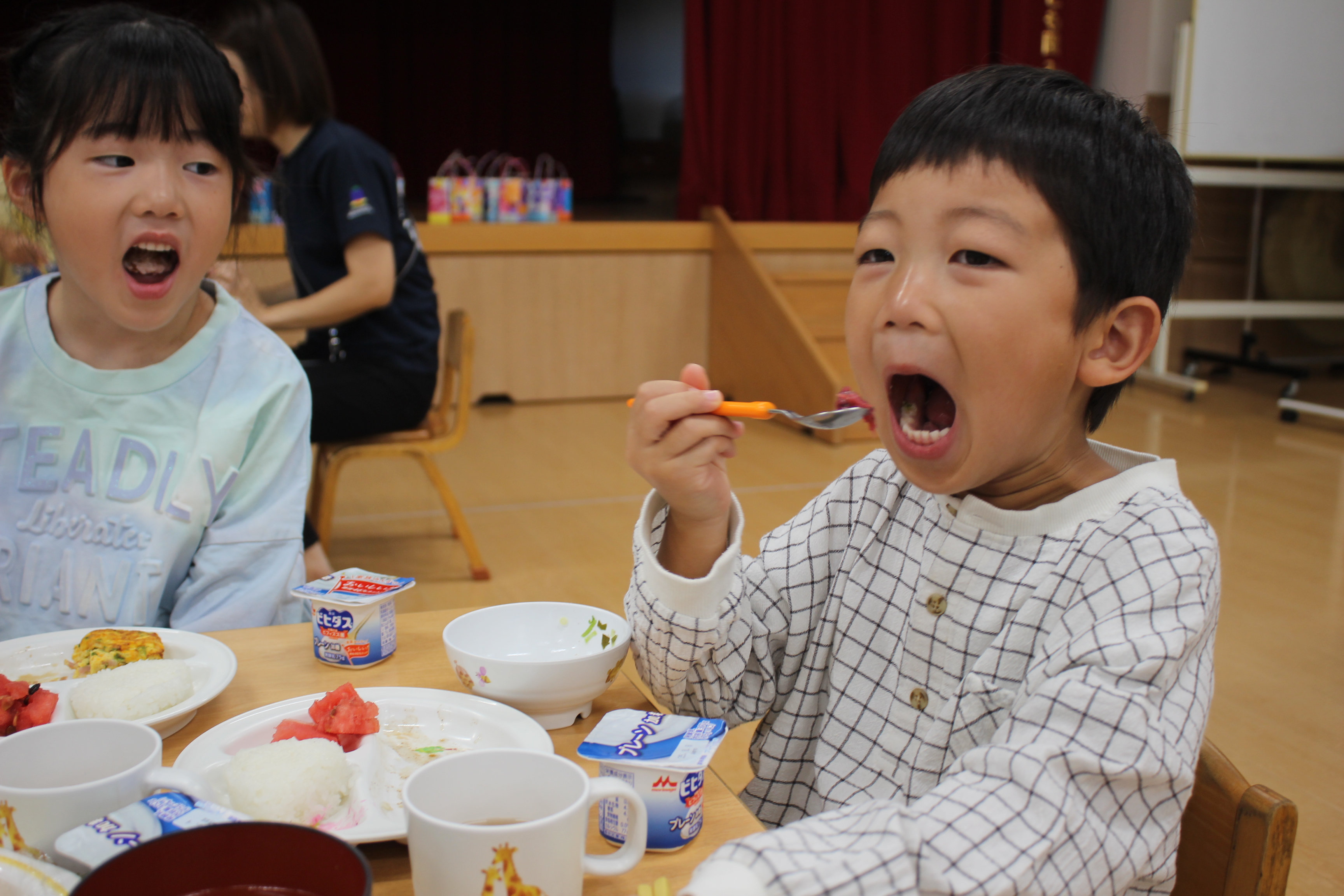 お泊り保育の朝食で食べた子どもたち。食べ慣れている子、くしゃくしゃの顔で食べる子、